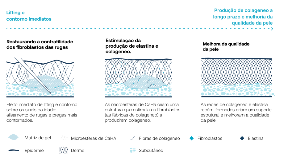 As microesferas de CaHA criam estruturas que estimulam os processos naturais do corpo para produzir novo colagénio e elastina. Ao longo do tempo, o corpo dissolve estas minúsculas microesferas e o gel, deixando apenas o colagénio natural recém-formado.